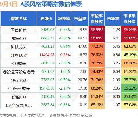 風(fēng)格策略指數(shù)方面,國信價值的市盈率百分位較高,為98.99%。而HK高股息港元的市盈率百分位較低,為65.15%。