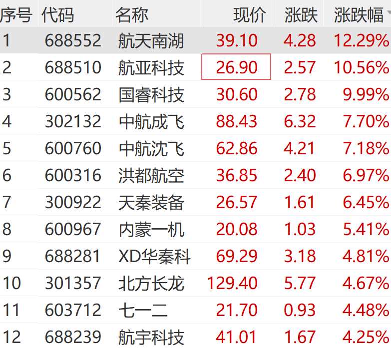 另外,上午國(guó)防軍工概念火熱,航天南湖、航亞科技漲超10%,國(guó)??萍迹?00562)漲停,中航沈飛(600760)、中航成飛(302132)等漲幅居前。
