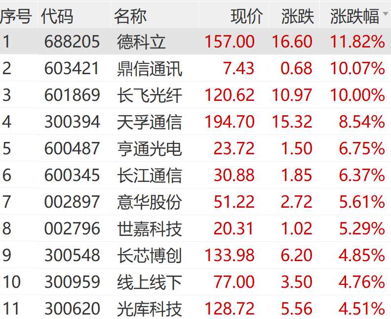 9月19日,通信板塊盤初走高。長(zhǎng)飛光纖(601869)開(kāi)盤迅速漲停,股價(jià)再創(chuàng)新高;鼎信通訊(603421)漲停,德科立漲超11%,天孚通信(300394)、亨通光電(600487)等跟漲。