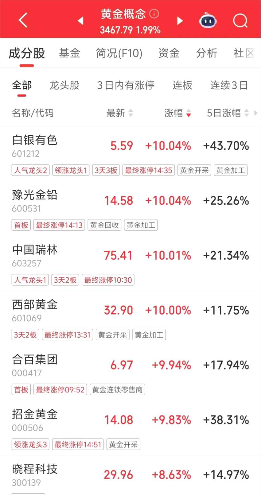 黃金概念午后拉升,龍頭股豫光金鉛(600531)漲停,股價創(chuàng)歷史新高,西部黃金(601069)漲停,實現(xiàn)“3天2板”。