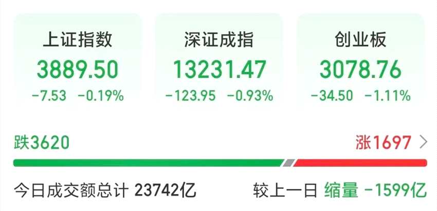 截至收盤,上證指數(shù)跌0.19%,深證成指跌0.93%,創(chuàng)業(yè)板指跌1.11%。市場全天成交額超2.37萬億元。