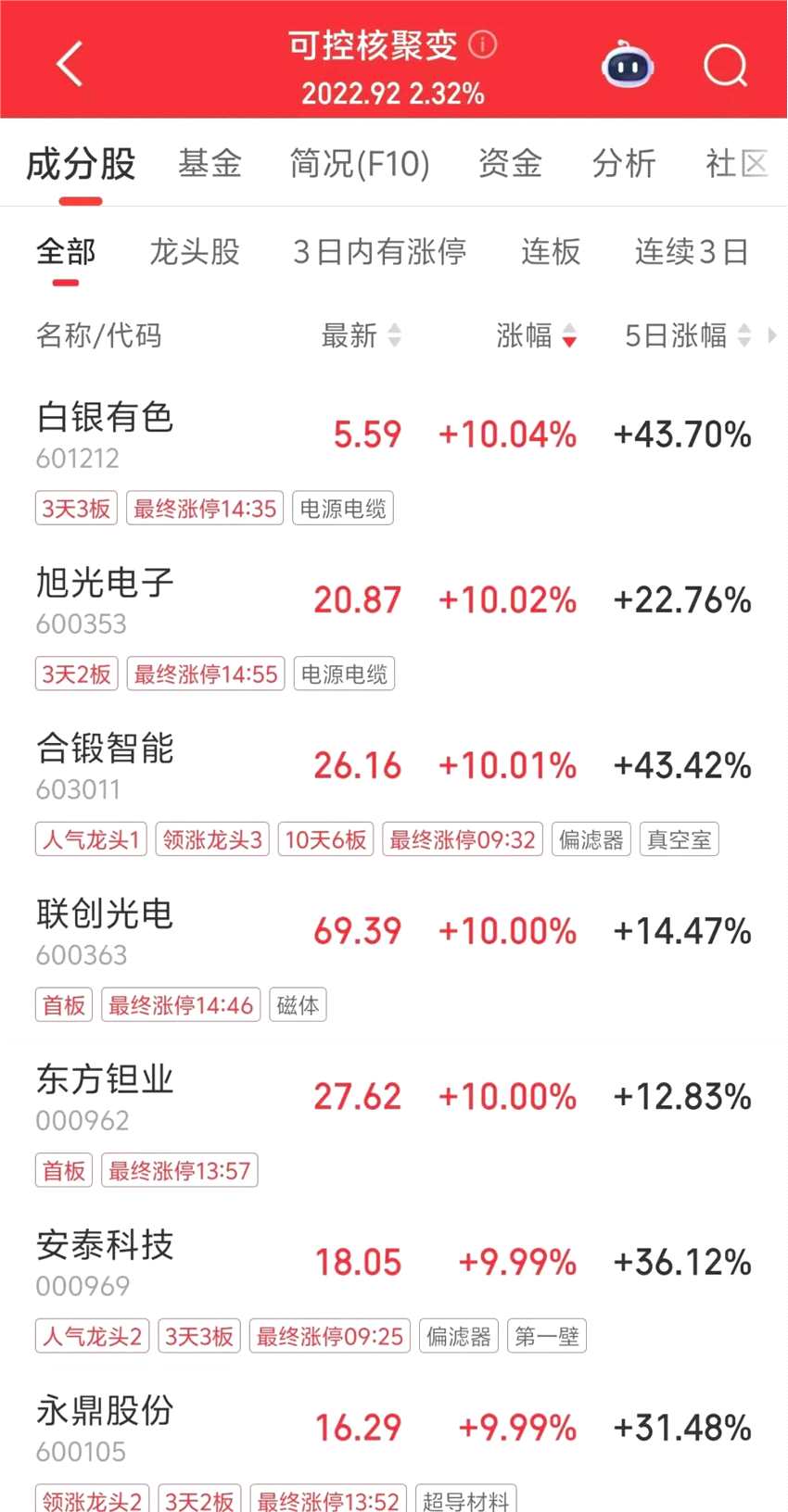 今日午后,可控核聚變概念股持續(xù)拉升,合鍛智能、東方鉭業(yè)(000962)、永鼎股份(600105)等多股漲停。同花順(300033)數(shù)據(jù)顯示,近5個交易日,可控核聚變概念累計上漲10.59%。