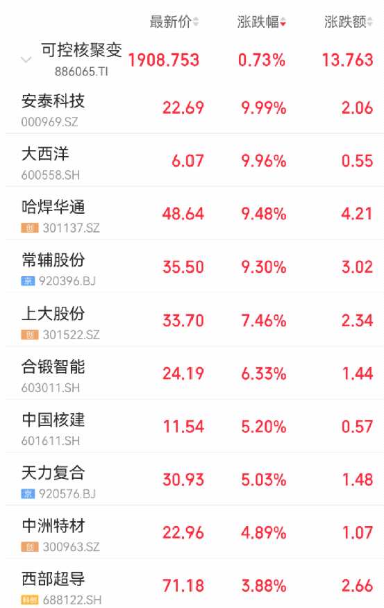 10月22日上午,A股可控核聚變板塊盤(pán)中拉升,安泰科技(000969)、大西洋漲停,哈焊華通、上大股份、中國(guó)核建等多股走高。