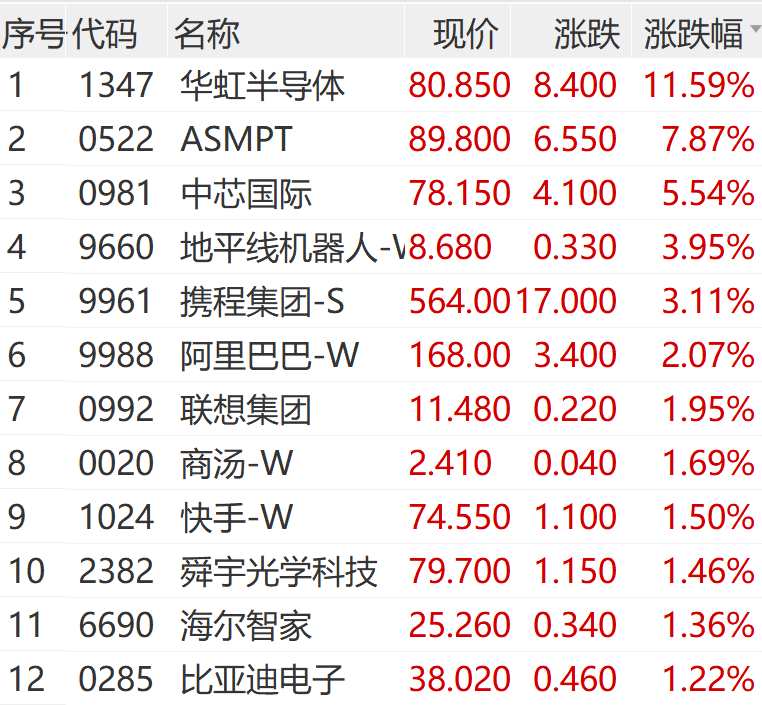 港股市場(chǎng)上午同步飄紅,截至午間收盤(pán),恒生指數(shù)漲0.59%,恒生科技指數(shù)漲1.22%,恒生國(guó)企指數(shù)漲0.46%;華虹半導(dǎo)體漲近12%,領(lǐng)漲恒生科技指數(shù)成份股。