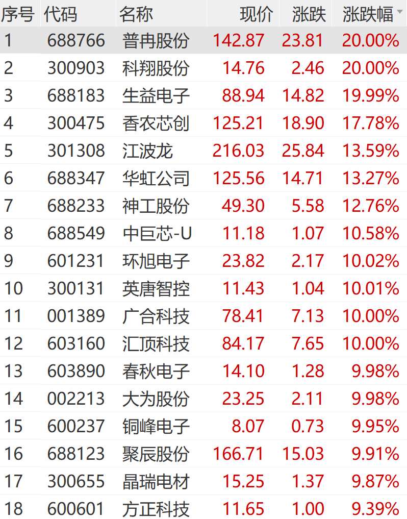 個(gè)股方面,普冉股份、科翔股份、生益電子等走出20cm漲停,春秋電子(603890)、大為股份等多股漲停,香農(nóng)芯創(chuàng)、江波龍(301308)、華虹公司等漲超10%。