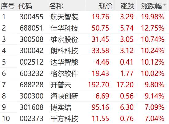 計(jì)算機(jī)板塊盤(pán)中發(fā)力,航天智裝20cm漲停,格爾軟件(603232)、達(dá)華智能(002512)等漲停。