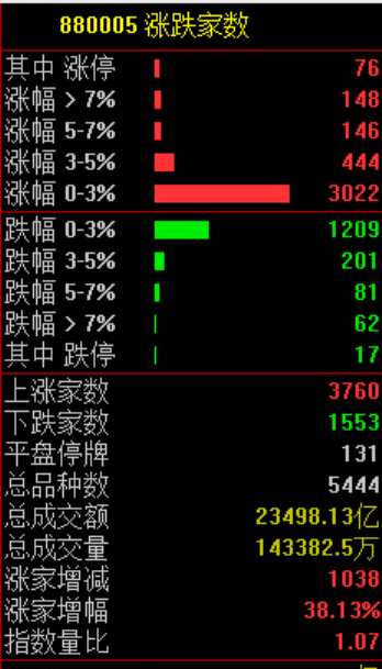 市場共3760只個股上漲,76只個股漲停,1553只個股下跌。