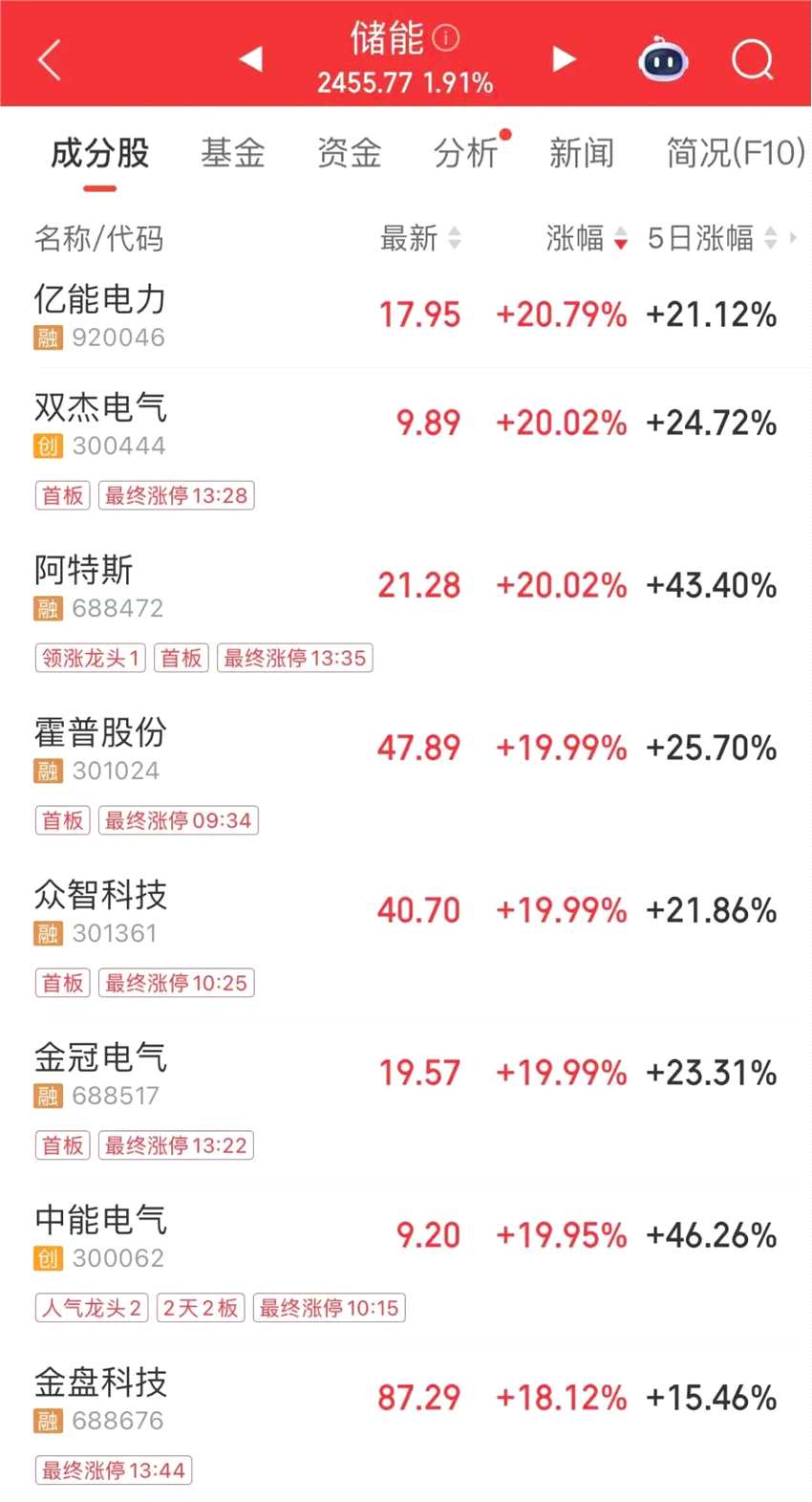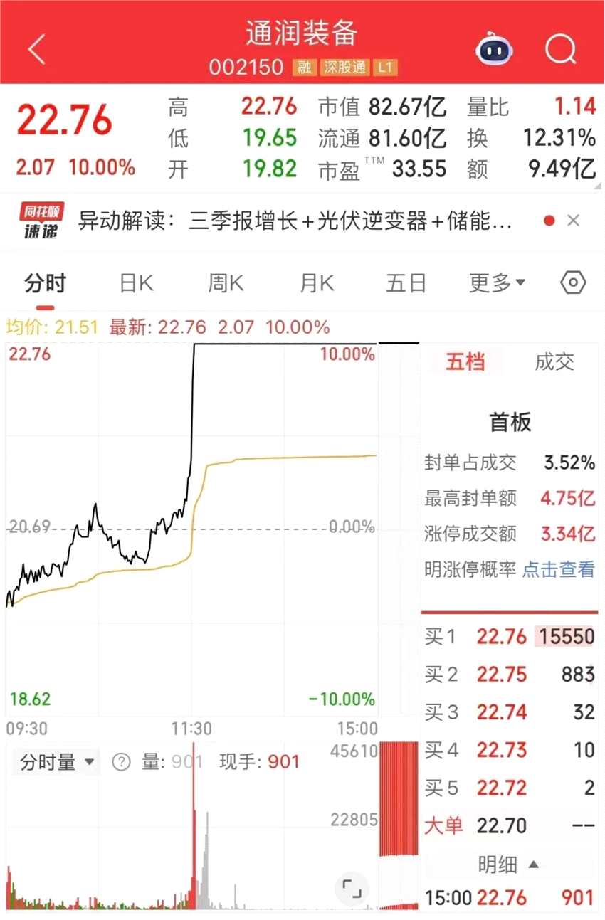 儲能概念股午后持續(xù)拉升,通潤裝備等漲停,陽光電源漲超7%。