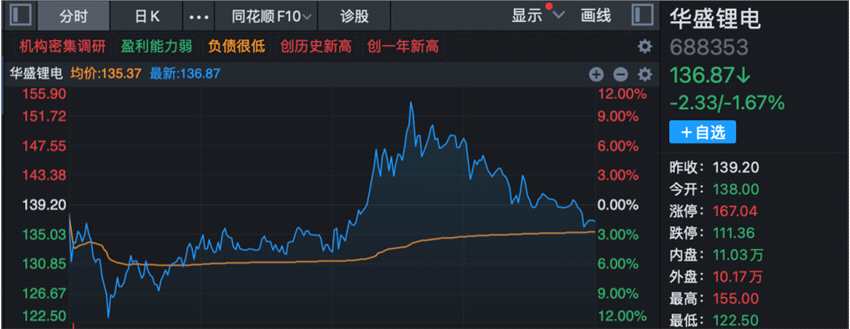 除鋰礦和鋰電外,另一鋰電材料電解液同樣沖高。17日午后,鋰電池電解液概念震蕩回升。早盤一度跌逾10%的華盛鋰電(688353)盤中一度反彈漲超10%,續(xù)創(chuàng)歷史新高。永太科技(002326)走出7天4板;科隆股份(300405)、清水源(300437)、??菩略矗?01292)、石大勝華(603026)、新宙邦(300037)漲幅靠前。