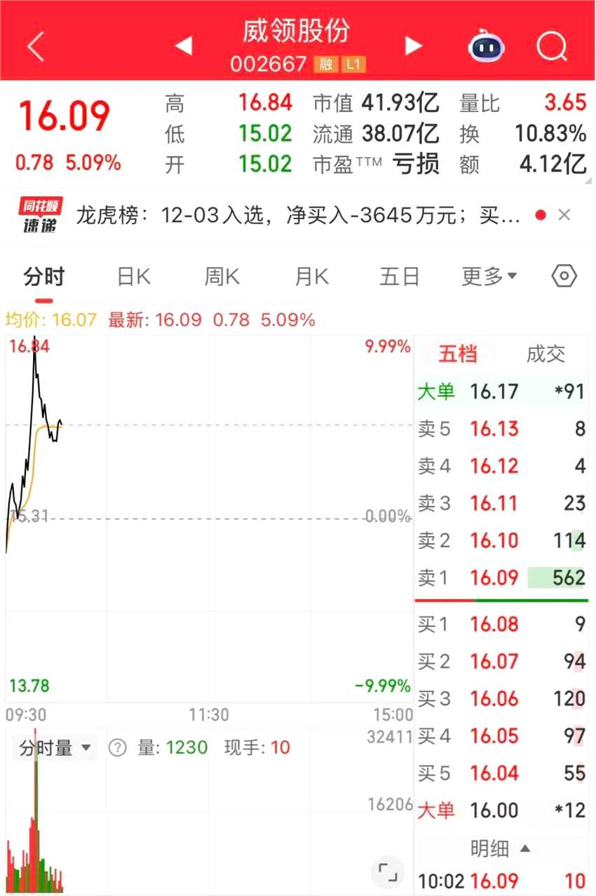 鋰板塊短線拉升,威領(lǐng)股份(002667)(002667)9時(shí)37分左右直線拉升,9時(shí)47分觸及漲停,截至發(fā)稿,漲幅回落,漲超5%,報(bào)16.09元/股。永杉鋰業(yè)(603399)、天齊鋰業(yè)(002466)、西藏礦業(yè)(000762)、盛新鋰能(002240)等盤(pán)中走高后紛紛跳水。