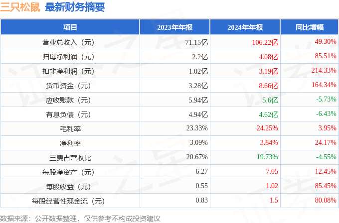 據(jù)公開數(shù)據(jù)整理,近期三只松鼠(300783)發(fā)布2024年年報(bào)。截至本報(bào)告期末,公司營業(yè)總收入106.22億元,同比上升49.3%,歸母凈利潤4.08億元,同比上升85.51%。按單季度數(shù)據(jù)看,第四季度營業(yè)總收入34.53億元,同比上升36.35%,第四季度歸母凈利潤6653.14萬元,同比上升32.63%。本報(bào)告期三只松鼠盈利能力上升,毛利率同比增幅3.95%,凈利率同比增幅24.17%。