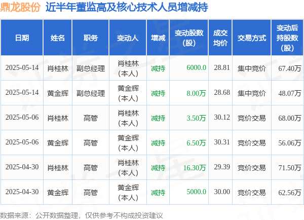 摘要: 消息,根據(jù)5月14日市場(chǎng)公開信息、上市公司公告及交易所披露數(shù)據(jù)整理,鼎龍股份(300054)最新董監(jiān)高及相關(guān)人員股份變動(dòng)情況:2025年5月14日公司副總經(jīng)理黃金輝、副總經(jīng)理肖桂林共減持公司股份8.6