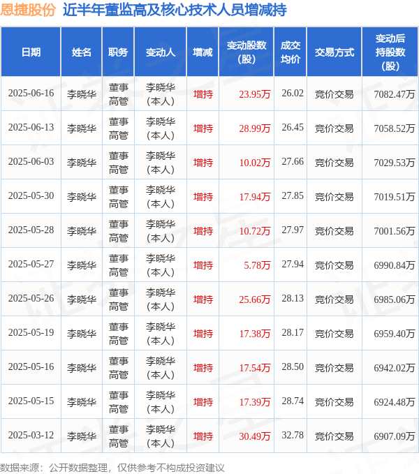 摘要: 消息,根據(jù)6月17日市場(chǎng)公開(kāi)信息、上市公司公告及交易所披露數(shù)據(jù)整理,恩捷股份(002812)最新董監(jiān)高及相關(guān)人員股份變動(dòng)情況:2025年6月16日公司董事,高管李曉華共增持公司股份23.95萬(wàn)股,