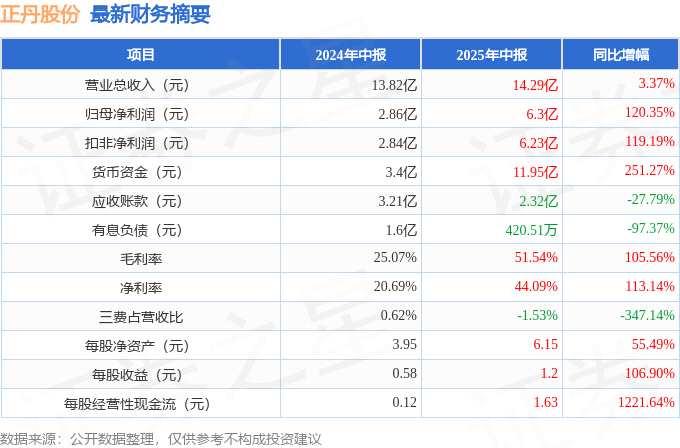 摘要: 據(jù)公開數(shù)據(jù)整理,近期正丹股份(300641)發(fā)布2025年中報。截至本報告期末,公司營業(yè)總收入14.29億元,同比上升3.37%,歸母凈利潤6.3億元,同比上升120.35%。