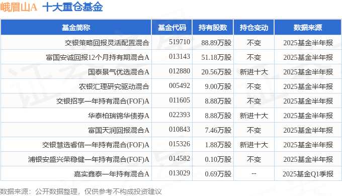 持有峨眉山A最多的基金為交銀策略回報(bào)靈活配置混合,目前規(guī)模為2.38億元,最新凈值1.513(8月7日),較上一交易日上漲0.53%,近一年上漲12.31%。該基金現(xiàn)任基金經(jīng)理為韓威俊。
