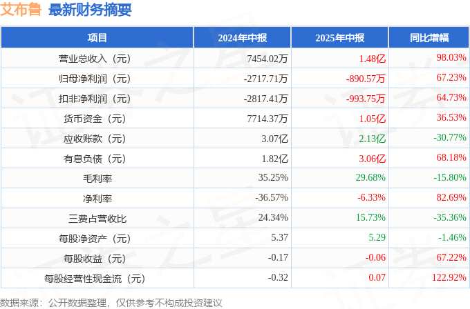 艾布魯(301259)2025年中報簡析:營收上升虧損收窄,公司應收賬款體量…