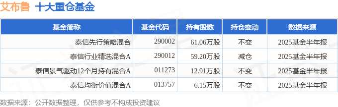 持有艾布魯最多的基金為泰信先行策略混合,目前規(guī)模為4.17億元,最新凈值0.5967(8月26日),較上一交易日上漲0.08%,近一年上漲33.05%。該基金現(xiàn)任基金經(jīng)理為王博強。