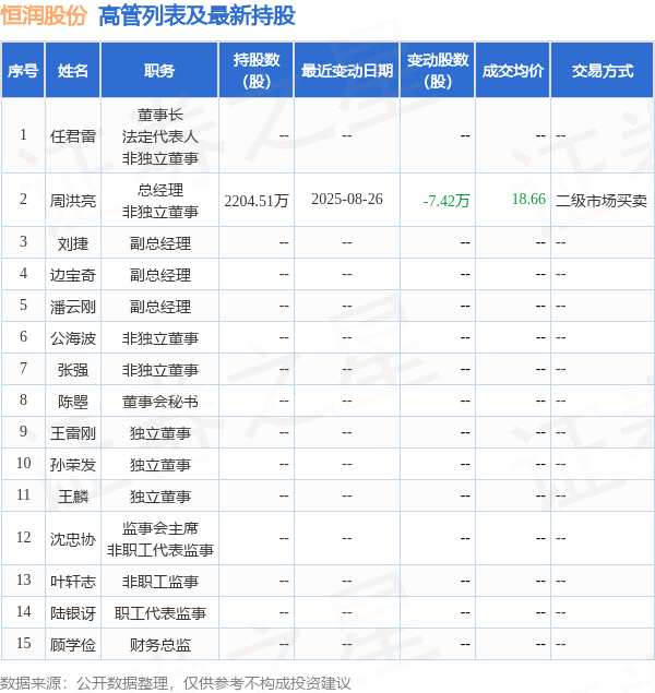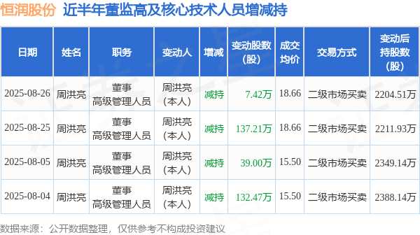 摘要: 消息,根據(jù)8月27日市場(chǎng)公開(kāi)信息、上市公司公告及交易所披露數(shù)據(jù)整理,恒潤(rùn)股份(603985)最新董監(jiān)高及相關(guān)人員股份變動(dòng)情況:2025年8月25日至2025年8月26日公司董事,高級(jí)管理人員周洪亮共減