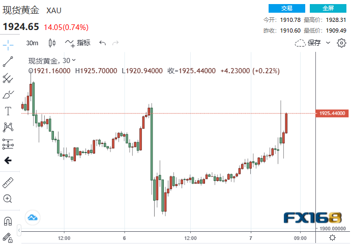 非農(nóng)就業(yè)報告出爐后,現(xiàn)貨黃金短線拉升10美元,刷新日高至1928.31美元。
