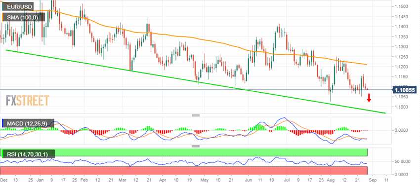 F 周三(8月28日)歐市盤中,歐元/美元位于1.1090附近水平徘徊。日內(nèi)匯價繼續(xù)震蕩承壓,延伸跌勢至1.1083低點后略微有所反彈,但整體走勢低迷。
