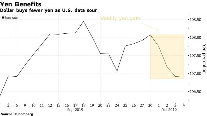 日元上周漲0.9%,為一個多月以來最大單周漲幅,因美國服務(wù)和制造業(yè)報告均遜于預(yù)期,9月份勞工數(shù)據(jù)好壞參半。