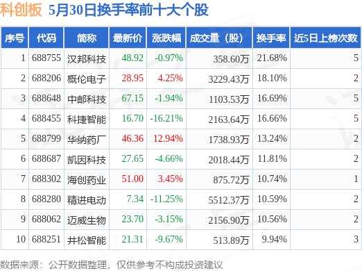 5月30日科創(chuàng)板換手率前十大個(gè)股,漢邦科技居首
