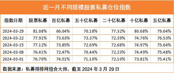 分規(guī)模來看,截止3月29日,十億規(guī)模私募倉位最高,為80.68%;百億私募更偏保守,倉位指數(shù)最低,為66.04%。