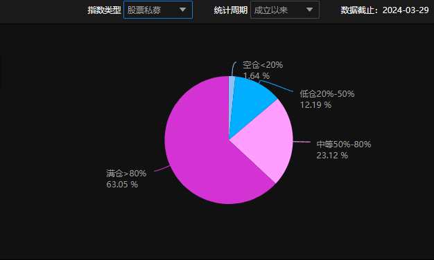 3月以來,越來越多的股票私募傾向于滿倉操作。具體來看,滿倉股票私募占比63.05%,中等倉位股票私募占比為23.12%,而低倉和空倉股票私募占比僅為12.19%和1.64%。