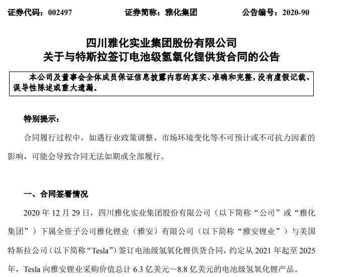 昨天股價剛剛跌停的雅化集團(002497),今天卻上演一字漲停板!皆因“抱大腿”成功,一紙公告宣稱,雅化集團與特斯拉簽訂大合同,在2021年至2025年,特斯拉將向雅安鋰業(yè)采購價值總計6.3億美元―8.8億美元的電池級氫氧化鋰產(chǎn)品。