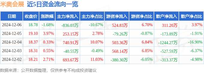 摘要: 消息,截至2024年12月6日收盤,米奧會(huì)展(300795)報(bào)收于18.78元,下跌1.68%,換手率3.09%,成交量4.16萬手,成交額7838.27萬元。12月6日的資金流向數(shù)據(jù)方面,
