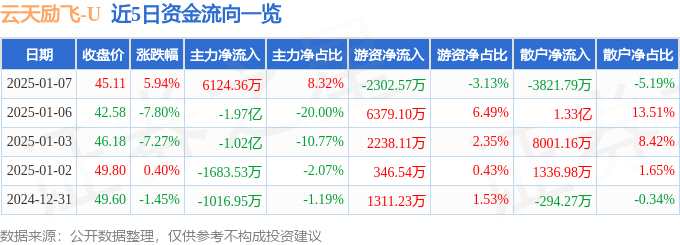 云天勵飛(688343)1月7日主力資金凈買入6124.36萬元