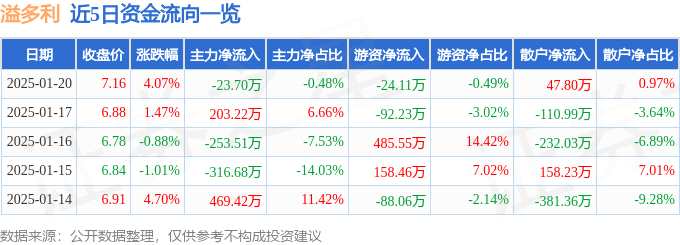 消息,截至2025年1月20日收盤,溢多利(300381)報收于7.16元,上漲4.07%,換手率1.41%,成交量6.9萬手,成交額4929.37萬元。