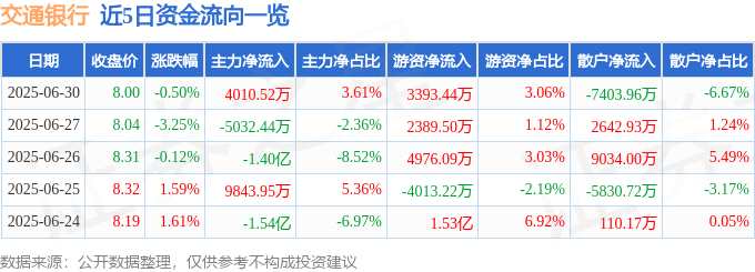 消息,截至2025年6月30日收盤,交通銀行(601328)報收于8.0元,下跌0.5%,換手率0.35%,成交量138.64萬手,成交額11.1億元。
