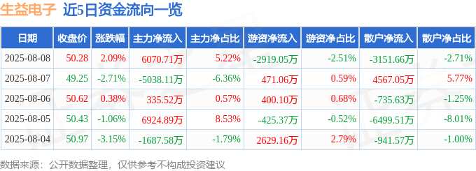 摘要: 消息,截至2025年8月8日收盤,生益電子(688183)報(bào)收于50.28元,上漲2.09%,換手率2.73%,成交量22.73萬手,成交額11.63億元。8月8日的資金流向數(shù)據(jù)方面,