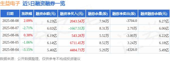生益電子融資融券信息顯示,融資方面,當(dāng)日融資買入1.28億元,融資償還1.08億元,融資凈買入2043.54萬元。融券方面,融券賣出8055.0股,融券償還1.18萬股,融券余量7.94萬股,融券余額399.1萬元。融資融券余額6.27億元。