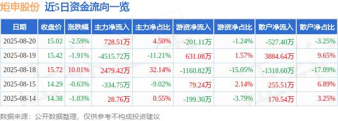 摘要: 消息,截至2025年8月20日收盤,炬申股份(001202)報(bào)收于15.02元,下跌2.59%,換手率9.3%,成交量10.87萬手,成交額1.62億元。8月20日的資金流向數(shù)據(jù)方面,