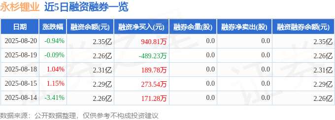 消息,截至2025年8月20日收盤,永杉鋰業(yè)(603399)報(bào)收于10.59元,下跌0.94%,換手率4.58%,成交量23.45萬(wàn)手,成交額2.49億元。