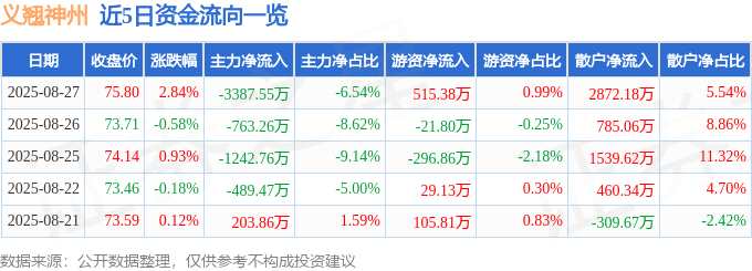 摘要: 消息,截至2025年8月27日收盤,義翹神州(301047)報收于75.8元,上漲2.84%,換手率5.5%,成交量6.58萬手,成交額5.18億元。8月27日的資金流向數(shù)據(jù)方面,