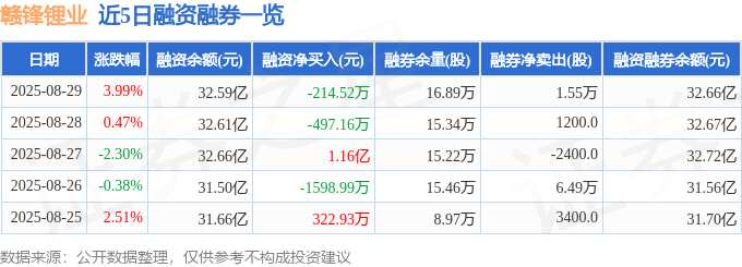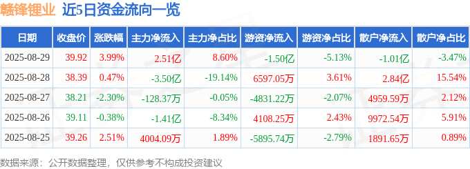 消息,截至2025年8月29日收盤,贛鋒鋰業(yè)(002460)報收于39.92元,上漲3.99%,換手率6.09%,成交量73.57萬手,成交額29.23億元。
