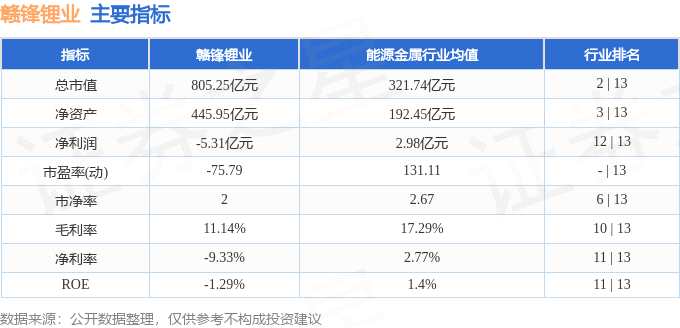 贛鋒鋰業(yè)2025年中報顯示,公司主營收入83.76億元,同比下降12.65%;歸母凈利潤-5.31億元,同比上升30.13%;扣非凈利潤-9.13億元,同比下降469.14%;其中2025年第二季度,公司單季度主營收入46.04億元,同比上升1.62%;單季度歸母凈利潤-1.75億元,同比上升45.44%;單季度扣非凈利潤-6.71億元,同比下降815.0%;負債率58.55%,投資收益3.14億元,財務(wù)費用7.24億元,毛利率11.14%。贛鋒鋰業(yè)(002460)主營業(yè)務(wù):貫穿上游鋰資源開發(fā)、中游鋰鹽深加工及金屬鋰冶煉、下游鋰電池制造及退役鋰電池綜合回收利用。